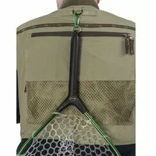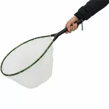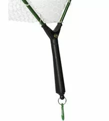 The lightweight, tubular aluminium frame, offers strength and rigidity and this is fixed to a moulded nylon Y-piece, attached to the lightweight ABS plastic handle, with a non-slip, moulded finish. Into the end of the handle is fitted a strong magnetic release, which is in turn fitted to a moulded ring and aluminium carabiner, for convenient and quick release, when required. The ‘rubber mesh’ is a synthetic rubber, made from the latest, clear, moulded PVC, which is soft, lightweight and clear in the water, so as not to spook fish. Graduated mesh size to reduce water resistance.Â